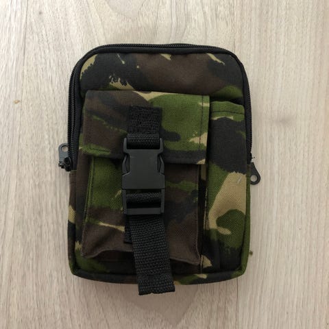 MOLLE-yhteensopiva varustetasku mustaa kangasta. Taskussa on vaakasuuntaiset MOLLE-kiinnityshihnat etupuolella ja pystysuuntaiset hihnat neppareilla takapuolella kiinnitystä varten esimerkiksi liiviin, reppuun tai vyöhön. Tasku suljetaan vetoketjulla, ja sisäpuoli on vuorattu kankaalla. Soveltuu pienten tarvikkeiden, kuten ensiapuvälineiden tai työkalujen, kuljettamiseen ja järjestämiseen ulkoilu- ja harrastekäytössä.