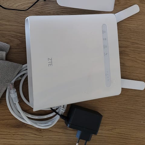 ZTE MF286A reititin valkoinen. Laitteessa on useita Ethernet‑portteja kiinteille verkkoyhteyksille sekä liitännät puhelin- ja virtajohdolle. Sopii kodin tai pienen toimiston verkkoyhteyksien jakamiseen langallisesti ja langattomasti. Mukana virtalähde.