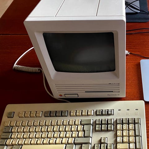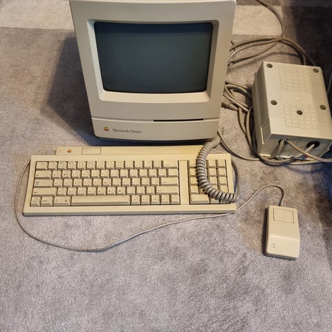 Apple pöytätietokone, jossa erillinen näyttö, näppäimistö ja hiiri. Mukana tulee ulkoinen laite, joka on kytketty tietokoneeseen kaapeleilla, sekä kansio, jossa on useita Apple Macintosh -yhteensopivia CD-levyjä. Kokonaisuus soveltuu esimerkiksi vanhojen Macintosh-ohjelmien ja -tiedostojen käyttöön tai keräilykäyttöön. Laite käynnistyy, mutta näyttö ei toimi.