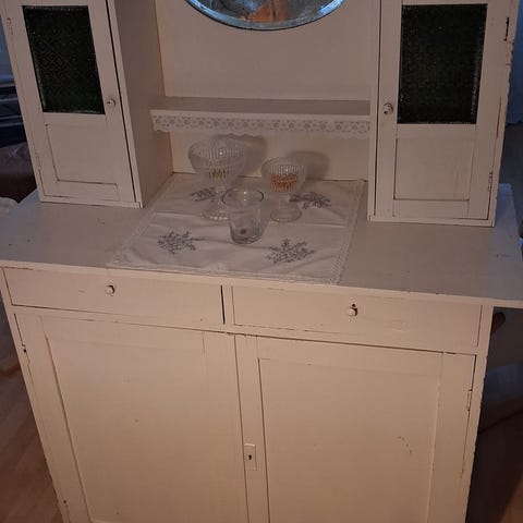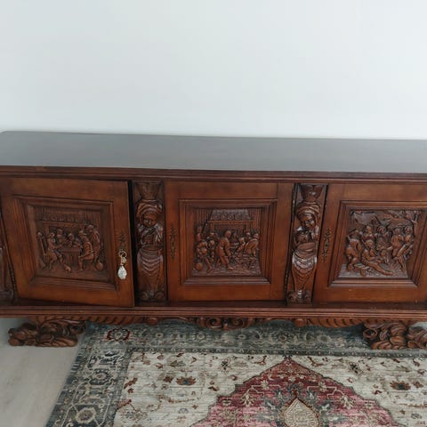 Upea vanha puinen barokkityylinen tilava kaappi kahdella ovella ja yhdellä laatikolla. Upeat koristeet ja yksityiskohdat. Avaimet tallessa, ovet saa lukittua. Kunto hyvä. Kannessa joitakin jälkiä.
