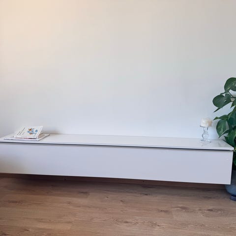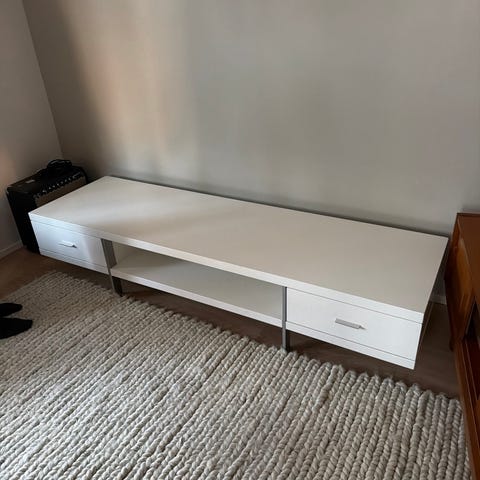Kovakiiltopintainen valkoinen tv-taso. Kaksi laatikkoa, joiden sisäpinta vaalean harmaa. Todella hyvässä kunnossa muutamaa tason jälkeä lukuunottamatta (näkyy kuvissa). Vain nouto!