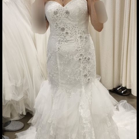 Myydään kaunis, uutena ostettu, yhdet häät käynyt, norsunluunvärinen (kuvassa näyttää liian kellertävälle) morsiuspuku.