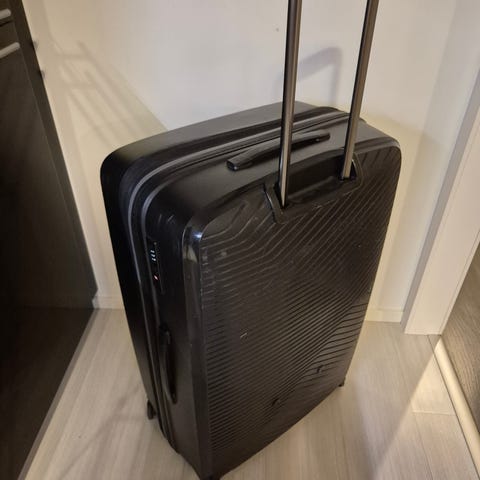 Keskikokoinen violetin värinen matkalaukku. Laukku on noin 3 vuotta vanha ja siinä on käytön jälkiä. Laukussa on neljä pyörää ja ne toimivat hyvin.