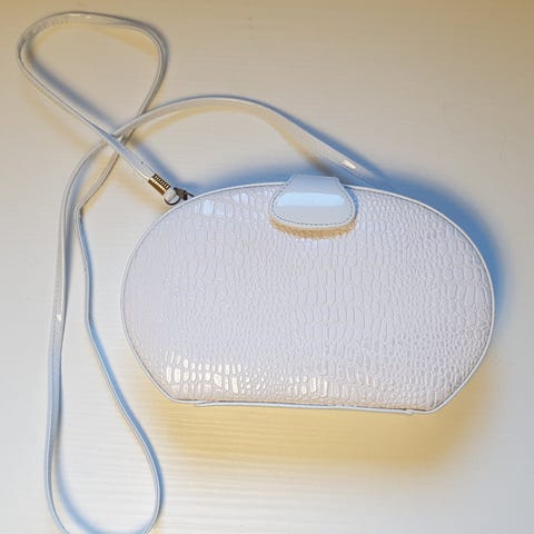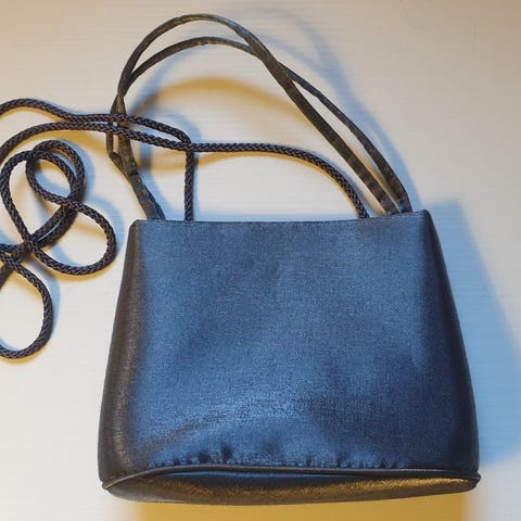 Vaaleanpunainen iltalaukku naisille. Materiaalina tekonahka, väriltään vaaleanpunainen. Laukussa on metallinen kehys ja klipsikiinnitys sekä irrotettava tai sisään taitettava kultainen olka-/kettinkihihna. Etupuolella on kaksi kangasruusukekoristetta. Sisäosassa on yksi vetoketjullinen sivutasku.