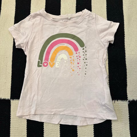 Vaaleanpunainen Peuhu-paita (koko 100): Lyhythihainen paita, jossa on iloinen "Live your dreams" -kuosi sateenkaarella ja herkuilla. Helmassa nätti röyhelö.