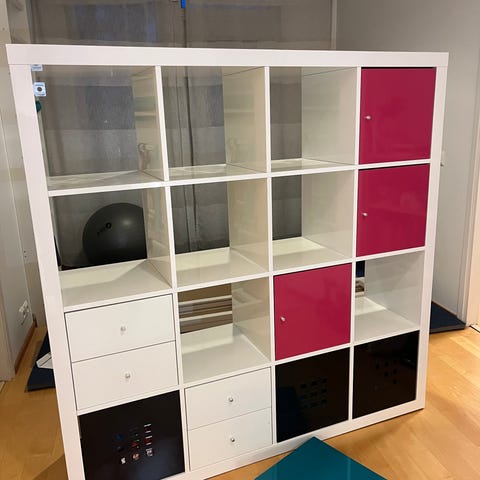 Myydään muuton alta Ikean 4x4 Kallax-hyllykkö, jossa kaksi kaappia (vihreä kellotaulu ja valkoinen ovi) sekä kaksi vetolaatikostoa.