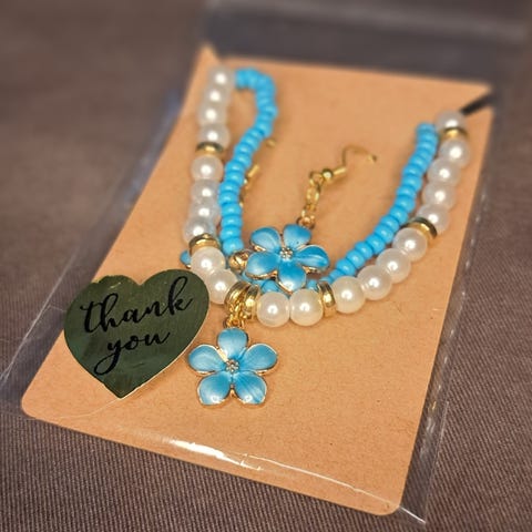 Setti on tehty kauniista sinisistä ja turkooseista helmistä.