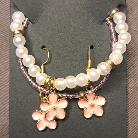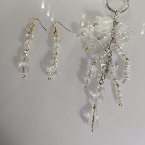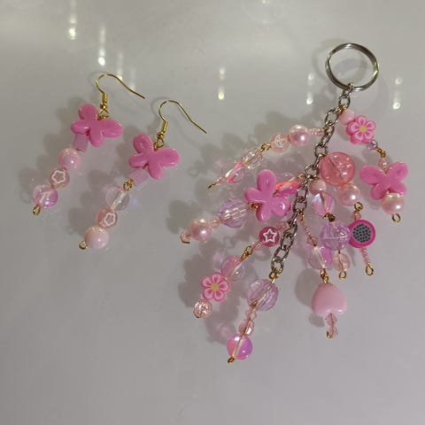 Myydään upea ja uniikki käsintehty setti, johon kuuluu korvakorut ja näyttävä avaimenperä.