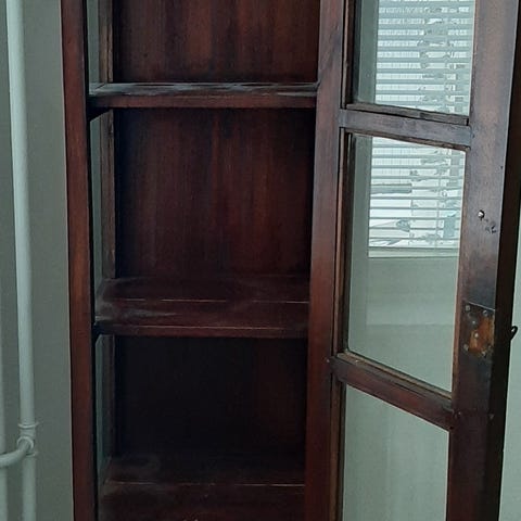 Väri petsattu ruskea. 4 hyllyä ja kaksi vetolaatikkoa.