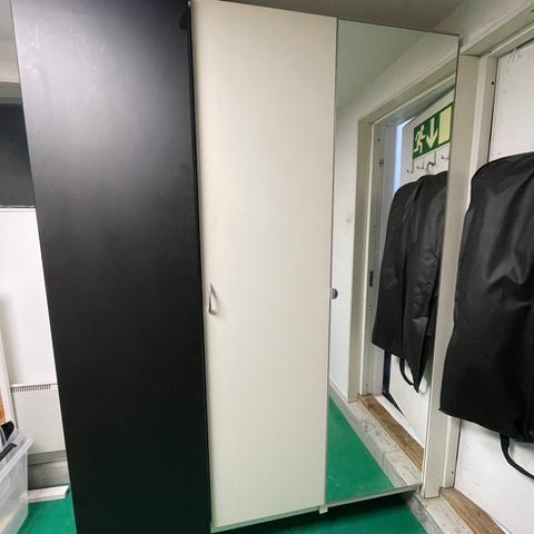 Annetaan valkoiseksi maalattu vanha apteekkarin kaappi. Keskellä yksi laatikko ja ulosvedettävä taso. Alaosan ovi poistettu (ei tallella) yläosan ovessa halkeilua (kuva). Lasihyllyt, 1 vetolaatikko keskellä ja 1 ulos vedettävä taso. Painava, omat kantajat mukaan.