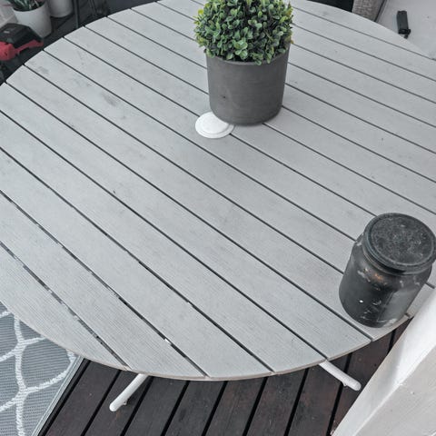Ehjiä ja hyväkuntoisia, pöydän halkaisija 60 senttimetriä, kokoontaitettavia. Pientä tummentumaa paikoin, katso kuva.