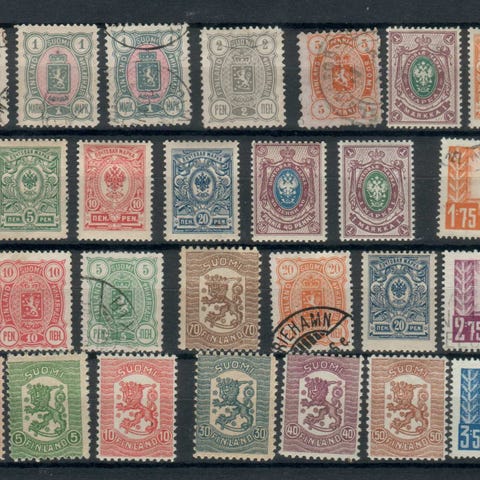 Suomi postimerkit kokoelma. Useita eri arvoisia ja värisiä, pääosin hammastettuja, leimattuja postimerkkejä. Sopii esimerkiksi filatelistille kokoelman täydentämiseen tai vanhojen suomalaisten postimerkkien tutkimiseen. Merkit toimitetaan kuvien mukaisessa lajitelmassa.