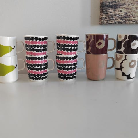 Siisti Marimekon vihreä muki tiilenpunaisella kuviolla.