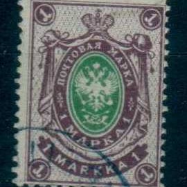 Postimerkki Venäjän keisarikunnan ajalta, nimellisarvo 1 markka. Merkissä on koristeellinen kehys ja keskellä vaakuna-aihe. Värit vihreä ja violetti. Sopii esimerkiksi filatelistien kokoelmiin tai historialliseksi esineeksi.