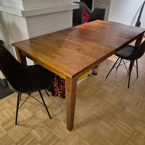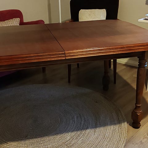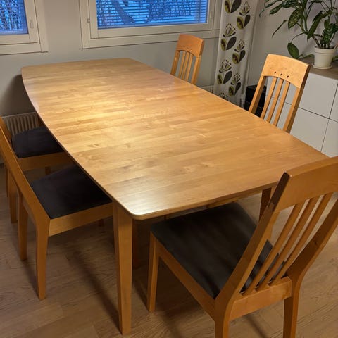 Jämäkkä ruokailuryhmä, johon kuuluu ovaalinmuotoinen puinen jatkettava ruokapöytä (155cm, jatkopala 45cm) ja kuusi tuolia. Materiaalina on lakattu mänty. Sopii keittiöön tai ruokailutilaan useamman hengen ruokailu- ja oleskeluryhmäksi.