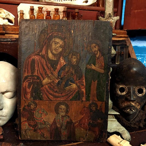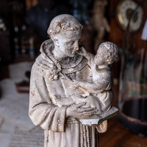 Muuta: Tämä noin 100 vuotta vanha uskonnollinen veistos esittää pyhää Joosefia, Kristuksen maallista isää, joka kantaa Jeesus-lasta sylissään. Patsas on valmistettu valumetallisesta ja sen jalusta on koristeltu goottilaisilla kohokuvioilla, mukaan lukien säteilevä sydän, joka viittaa Kristuksen Pyhään Sydämeen. Takaosasta löytyy nimikirjaimet “A.F.”, joka on taiteilijan signeeraus. Tämäntyyppisiä veistoksia valmistettiin erityisesti katolisen Euroopan alueella, erityisesti Ranskassa, Belgiassa ja Italiassa. Vastaavia patsaita ja veistoksia käytettiin esim. kotialttareissa ja myös kappeleissa. Hieno ja uniikki esine!
