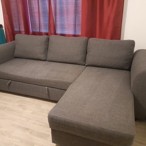 Iso tummanruskea divaanisohva, jonka saa levitettyä parisängyksi (makuukoko n. 200x130 cm). Divaanin alla kätevä iso säiltystila vaikkapa peitteille ja tyynyille. Ikää sohvalla 12 vuotta.