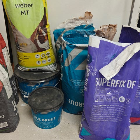 Harmaita lattialaattoja. Kahta eri kokoa. Isompia 24 kpl ja pienempiä 90 kpl. Lisäksi pari säkkiä laastia ja purkki primeria.
