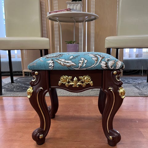 Polyrottinkinen rahipöytä istuintyynyllä ja lasilla.
