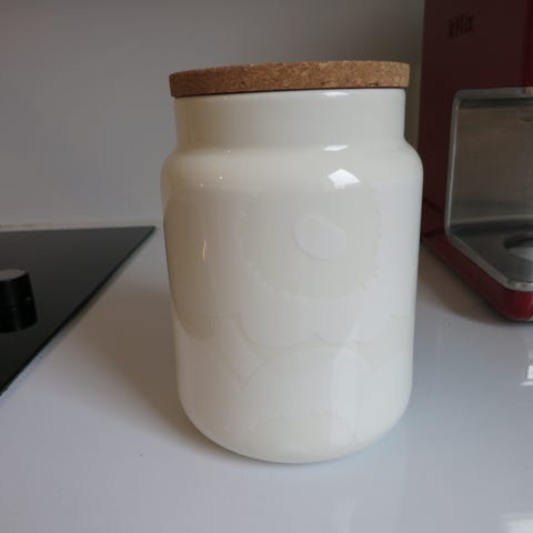 Marimekon Unikko -purkki 0,7L korkkikannella valkoisessa värissä. Käyttämätön.