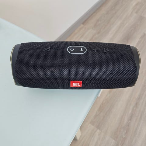 JBL Charge 3 Bluetooth-kaiutin. Kannettava, sylinterinmuotoinen langaton kaiutin, jonka väri on musta. Kaiuttimessa on päätyihin sijoitetut passiivisäteilijät, yläosassa painikkeet äänenvoimakkuudelle, toistolle ja Bluetooth-paritukselle sekä takana suojaluukun alla liitännät lataukselle ja ulkoiselle laitteelle. Sopii musiikin toistoon esimerkiksi puhelimesta tai tabletista kotona ja matkalla.