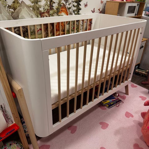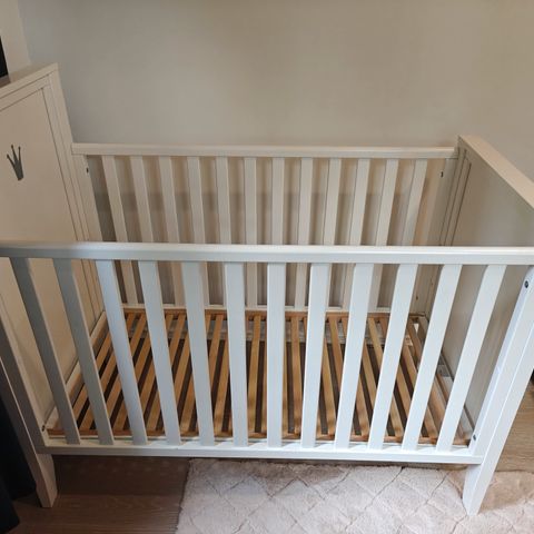 Troll Torsten pinnasänky, värinä harmaa ja luonnonpuu. Upean ja massiivisen näköinen, ei mikään rimpula. Joitain virheitä jo löytyy maalista, lasten käyttöönhän nämä on, mutta yleisilme oikein siisti. Mukaan saa vähän käytetyn patjan (Ikea) ja lisävarusteena hankitun samaan sarjaan kuuluvan junior- laidan, jolloin pinnasängyn saa muutettua taaperosängyksi.