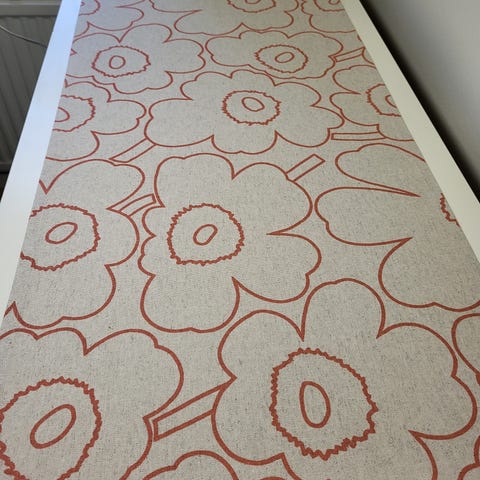 Marimekko puuvillapellavakankaasta ommeltu käyttämätön kaitaliina.