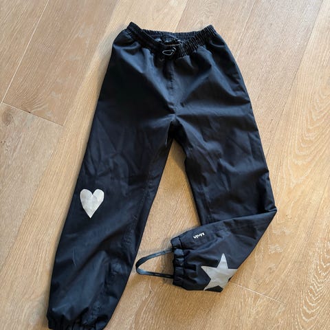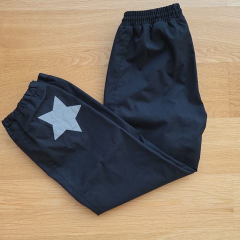 Pieni reikä paikattu vaatelaastarilla ja lahkeessa housuille tyypillinen pieni reikä (ei vaikuta käyttöön).