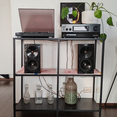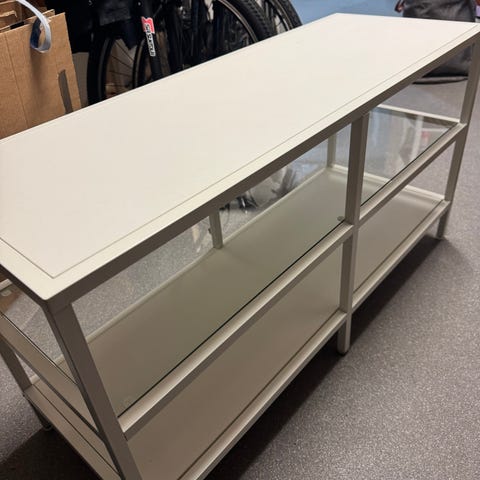 IKEA hylly mustalla metallirungolla ja lasihyllyillä. Ylä- ja alataso ovat umpinaiset, keskellä on kaksi lasihyllytasoa. Sopii esimerkiksi säilytykseen olohuoneeseen, keittiöön tai eteiseen. Kuvissa näkyy kulumajälkiä yläpinnan reunassa. Muuten siisti ja ehjä.