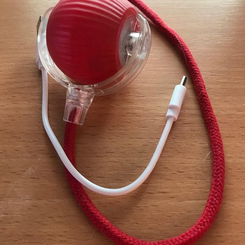 Kerran käytetty interaktiivinen leikkipallo kissalle. Punainen pallo, jossa pörröinen häntä. Laite on USB-ladattava (latausjohto mukana) ja sitä voi käyttää useilla eri alustoilla, kuten lattialla ja paksuillakin matoilla.