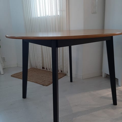 Siisti ja napakka valkoinen ruokapöytä, kannessa pieni nirhama, pöydän halkaisia 100 cm, ostettu muistaakseni jyskystä, haku pian rantakylästä