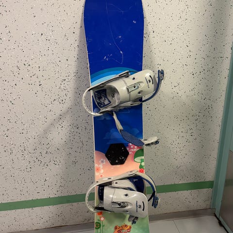 Oxygen lumilauta. Käytön jälkiä löytyy. Siteet jäykät, mutta toimivat. Olikin saman pituinen kuin edellinen lauta, joten ei päässyt meillä käyttöön.