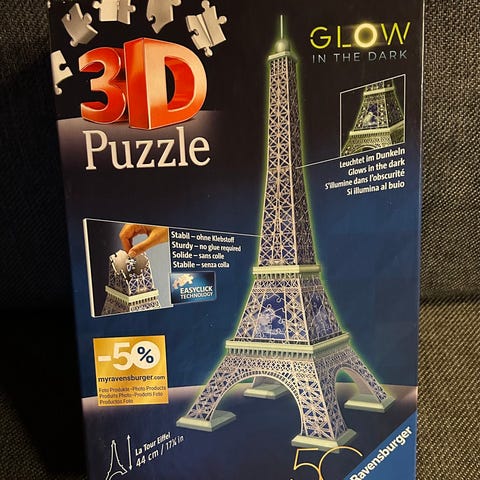 Ravensburger 3D Puzzle Night Edition Eiffel-torni on kolmiulotteinen palapeli, jossa rakennetaan Eiffel-tornin pienoismalli. Palapelissä on 216 palaa ja se on suunnattu 12 vuotta täyttäneille ja sitä vanhemmille. Valmiin mallin korkeus on noin 44 cm. Pakkauksessa on mukana valaistustoiminto, jolla torni voidaan valaista eri väreillä. Tuote sopii ajanvietteeksi ja koristeeksi valmiiksi koottuna.
