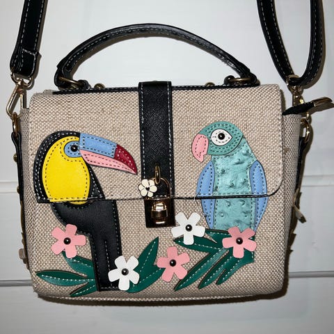 Sulokkaan pikkulaukku,etuosassa joitain naarmuja,olkahihna puuttuu.