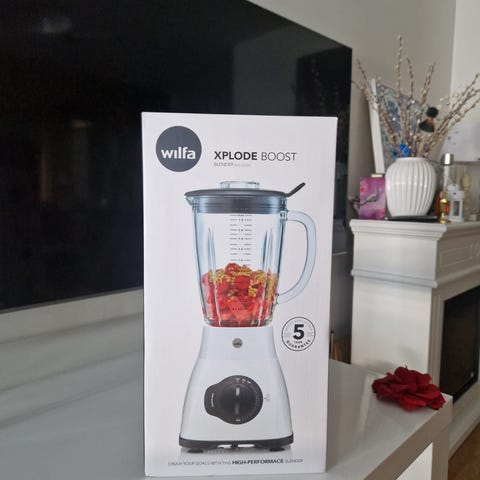 Wilfa tehosekoitin, jossa läpinäkyvä muovinen sekoituskannu mitta-asteikolla ja musta kahva. Pohjaosassa on musta ja teräksen värinen runko sekä pyöritettävä säätönuppi, josta voi valita nopeuksia ja pulssitoiminnon. Laitteessa on irrotettava kannu ja kansi, jotka helpottavat puhdistusta. Sopii esimerkiksi smoothieiden, keittojen ja erilaisten juomien sekoittamiseen kotikeittiössä.