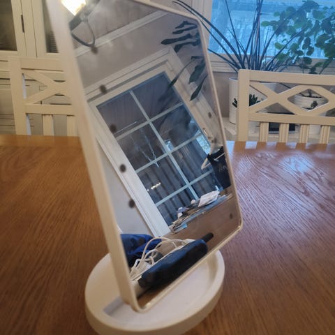 Kiva meikkipeili valoilla. Kork 44cm leveys 30cm. Jämäkän teeäsrungon päällä. Kääntyy pystysuunnassa. Johto tulee taakse kiinni. Lämmin ja viileä valo, kosketusnäppäimestä