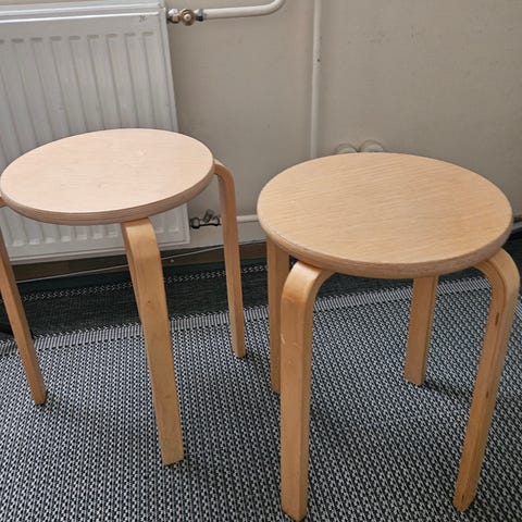 Pienet jakkarat 2kpl pörröpäällysteellä ja metallijaloilla. Istuimen halkaisija on 35 cm ja korkeus 42cm