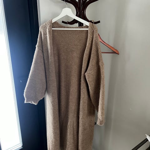 Naisten pitkä villatakki vyöllä. Erittäin siisti kerran päällä ollut. Pituus olkapäältä helmaan 123cm. Sopii hyvin M kokoiselle.