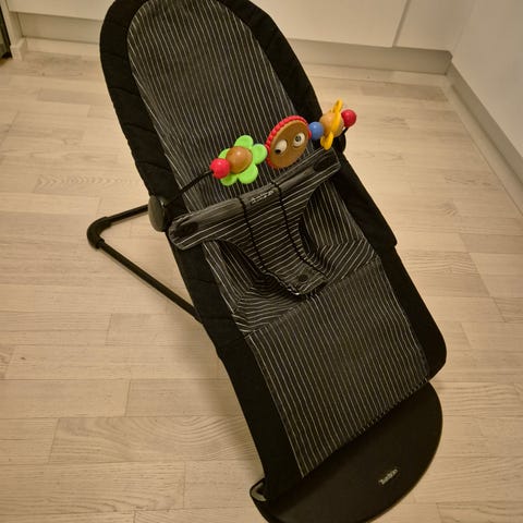 Hyväkuntoinen BabyBjörn -sitteri lelukaarella. Täysin toimiva, kankaassa pientä kulumaa ja yksi pieni tahra (en ole pessyt käytön jälkeen). Kankaan voi irrottaa ja pestä koneessa.