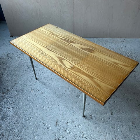 Harvinaisen upea sohvapöytä, jonka todelliset mitat saattavat yllättää. Sopii loistavasti suuren tilan keskipisteeksi ja katseenvangitsijaksi. Runko on käytännössä naarmuton, lasi moitteettomassa kunnossa. Pöytälevyn pinnassa iälle ominaisesti joitakin vähäisiä kulumia/sävyeroja. Pöydän mitat: 110x110x42,5 cm korkeus irtonaisen lasin kanssa ja noin 41,5cm korkea ilman lasia. Paino kaikkinensa arviolta lähemmäs 100 kg. Pöytälevy ilmeisesti täyttä puuta. Kestää vaikka tanssit.