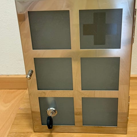 Lääkekaappi metallia lasiovella. Ei ole koskaan otettu käyttöön, vaikka ikää jo jonkin verran onkin. Tyylikäs rosterin ja savulasinyhdistelmä. Lukko ja mikä parasta, myös avain kyseiseen lukkoon.