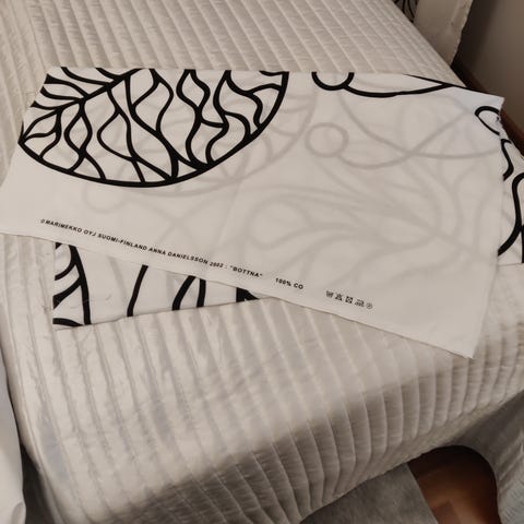 Myyn hyväkuntoisen Marimekko Ananas-kankaan, jota on käytetty pöytäliinana. Yhdessä kohdassa on pieni pyöreä steariinijälki, jolla kokoa on 10 sentin kolikon verran. Pituus kankaalla on 210 cm, leveys 150 cm. Kankaan päädyt on ommeltu siististi.
