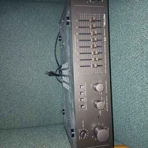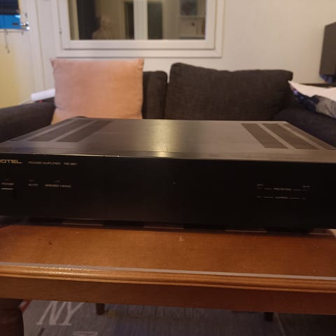 Teknisesti iskussa oleva Rotel RB-951 - päätevahvistin. Ihan käypäinen peli nykypäivänäkin vaikka hoitamaan aktiivikaiuttimien diskanttiosastoa.