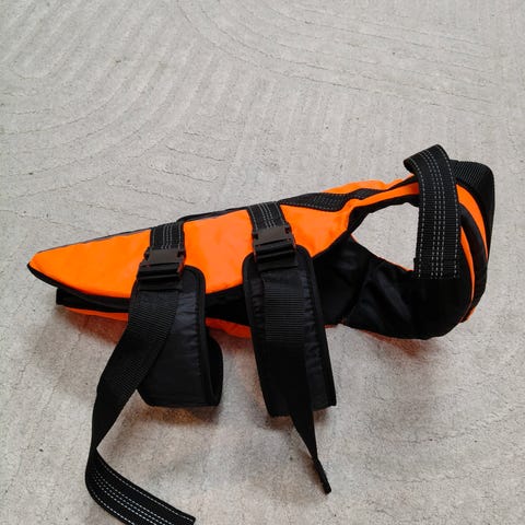 Rukka koiran pelastusliivi, koko L. Väri oranssi mustilla yksityiskohdilla. Liivissä on useita säätöremmejä ja solkia koon ja istuvuuden säätämiseen. Selkäpuolella on heijastinnauhoja näkyvyyden parantamiseksi sekä kantokahva koiran nostamista tai tukemista varten. Soveltuu koiralle vesillä liikkumiseen ja uimisen tueksi.