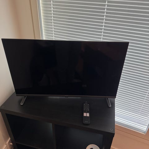 TCL televisio musta (TCL 32" S5K Full HD QLED TV). Kuvissa näkyy taustapaneeli liitäntöineen, joissa muun muassa HDMI-, USB- ja antenniliitännät. Mukana virtajohto ja kaukosäädin. Soveltuu esimerkiksi olohuoneen tai makuuhuoneen perustelevisioksi sekä ulkoisten laitteiden, kuten digiboksin, pelikonsolin tai mediatoistimen, näyttönä käytettäväksi.