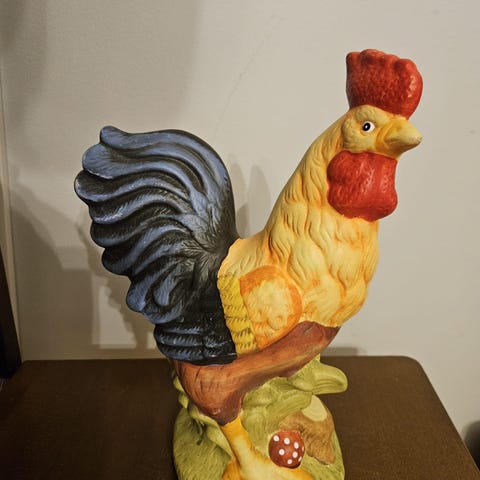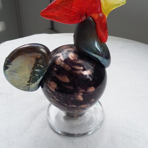 Keraaminen kukko, korkeus 15 cm, pituus 14 cm. Sisäosa leveys 10cmx 8 cm ja syvyys 4,5cm, mihin mahtuu esim. makeisia.