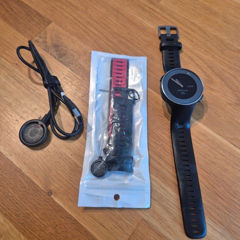 Toimiva kuvanmukainen kello, akunkesto hyvä. Lasissa käytönjälkiä. Mukana laturi.