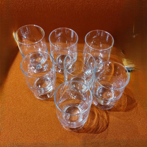 Lasit ovat hyvässä kunnossa ilman näkyviä vaurioita. Alkuun pesu.