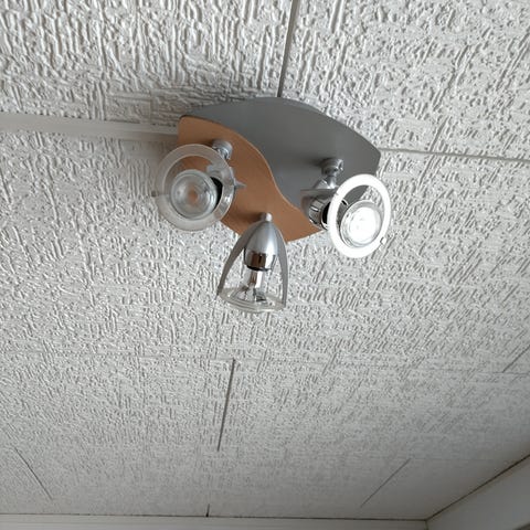 Metallinen kattovalaisin. Valaisimessa on kolmionmuotoinen kattokiinnike ja kolme suunnattavaa spottivaloa. Sopii yleisvalaistukseen esimerkiksi olohuoneeseen, keittiöön tai eteiseen. Mukana kiinnitysosa kattoon asennusta varten. Sokeripala-asennus.