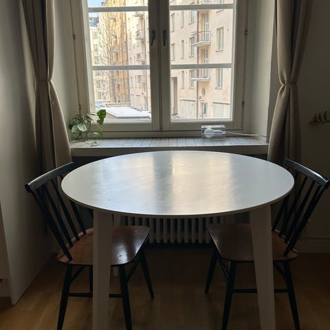 TARJOA! Pyöreä valkoinen ruokapöytä. Merkkiä ei ole tiedossa. Keskellä lisäpala ja sen ottamalla pois/laittamalla kiinni saa pöydästä pienemmän/isomman. Kivat vintage yksityiskohdat. Hyvä kunto. HAKU pitkänsillanranta, Helsinki.